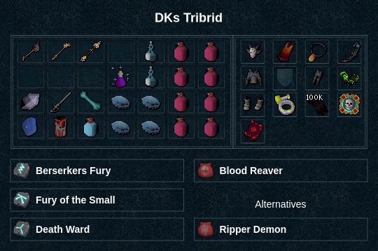 It’s possible to “semi-AFK” the Dagannoth Kings by switching weapons and using revolution, even without any hybrid armour. Normally, using armour that’s off-style has an accuracy penalty i.e. if using a Melee weapon, then magic/ranged armour will lower accuracy. For DKs, a combination of T90 weapons + overloads + T80 power armour of different styles will ensure 100% accuracy on all three kings. Higher armour or lower tier weapons will affect accuracy, but adding prayers/curses will get accuracy back up to 100%.