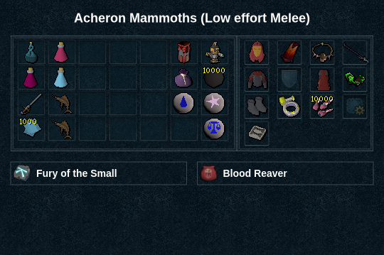 Acheron mammoths are one of the 4 raptor mobs and have the highest HP of the bunch. Although they give decent slayer XP, they don't drop any rare uniques and thus are the least popular of the raptor creatures. They attack with melee and ranged, with their ranged attack having the animation of throwing a ice ball. This attack is dodge-able always hits if it lands, dealing moderately heavy ranged damage.